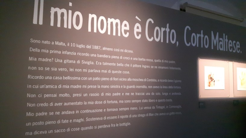 La prima sala inizia con una video intervista totalmente in francese sottotitolata in italiano, con interviste allo stesso artista o a persone a lui vicine. In seguito, si parte direttamente con la mostra vera e propria, divisa su due piani del Palazzo Pepoli, dove si narra la vita dell’autore Pratt, che, come racconta un pannello esplicativo, nasce a Rimini nel 1927 e gira per l’Italia tra Venezia e Addis Abeba, poi nel 1950 compie dei viaggi all’estero. Poi, è un susseguirsi di strisce e immagini ad acquerello delle sue creazioni, con citazioni e spiegazioni delle storie costruite.