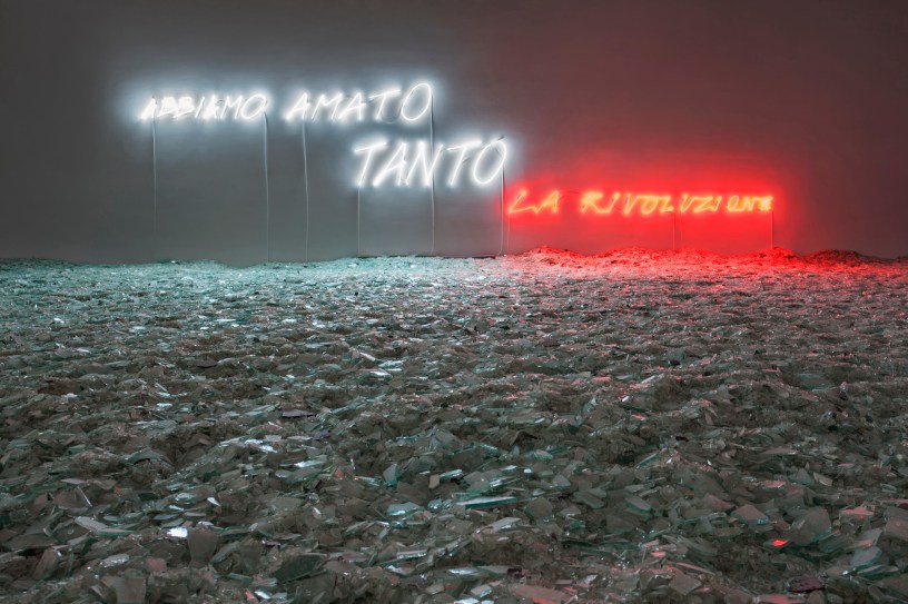 Posizionata nella sala centrale della fondazione – che ricordiamo essere un’ex fabbrica Lancia, quindi dall’aspetto di un hangar più che di uno spazio espositivo – quest’opera si compone di due parti: la prima una grossa scritta neon “abbiamo amato tanto la rivoluzione”, eco del titolo di un libro di Cohn-Bendit mentre la seconda parte si estende su tutto il pavimento antistante il neon e consiste in un oceano di vetri rotti, su cui il pubblico può camminare.