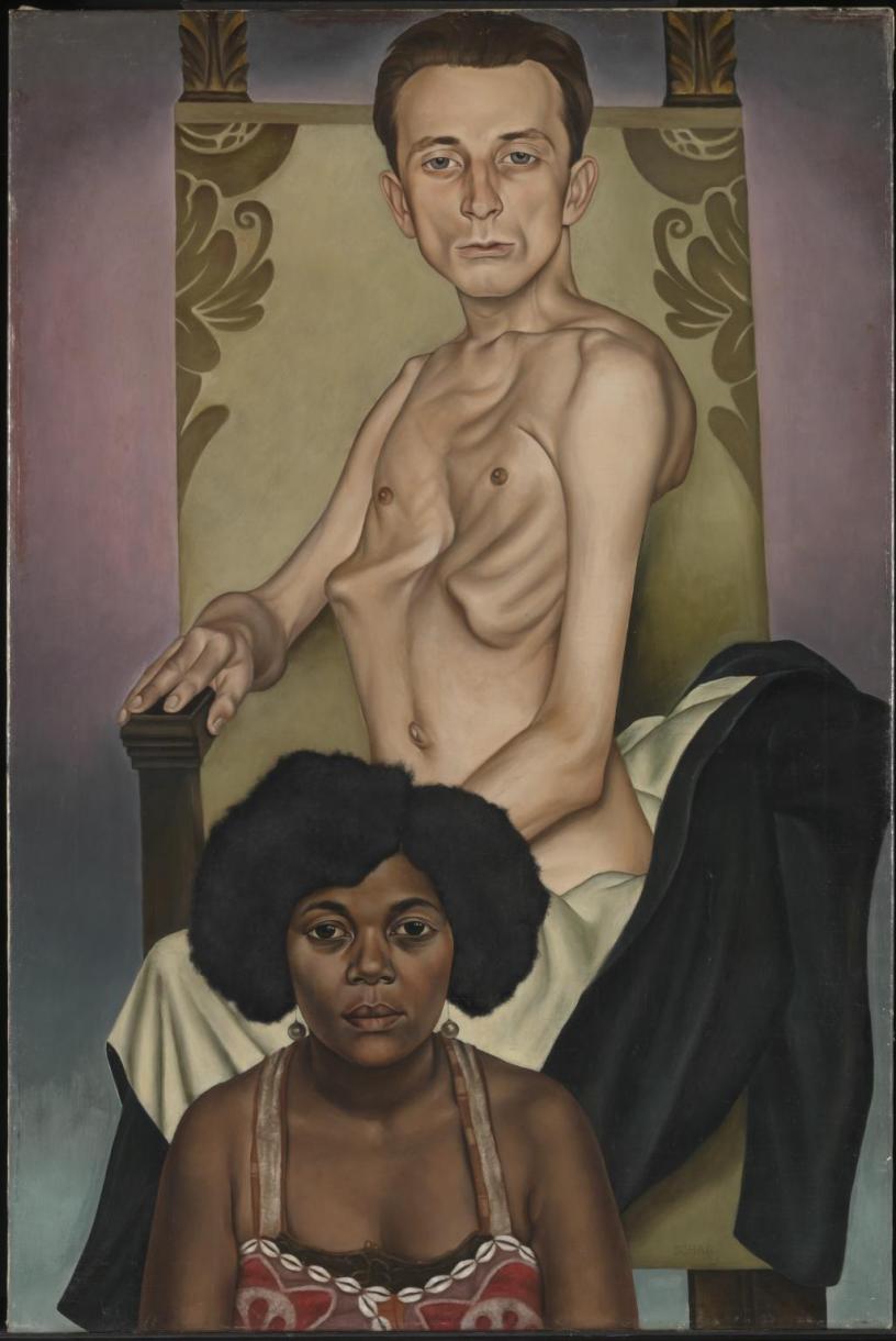 I due soggetti che Schad decide di immortalare nel 1929 nell’olio su tela che vediamo sono Agosta, l’uomo alato, e Rascha, la colomba nera: l’artista conobbe i due “fenomeni da baraccone” ad una fiera nel nord di Berlino, la Onkel Pelle; nel loro numero circense, Agosta esibiva il suo difetto fisico, la cassa toracica capovolta, accompagnato da Rascha, del Madagascar, sostenente un serpente fra le mani.