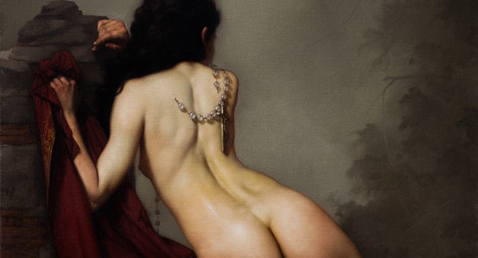 È una scena colma di sensualità, ma che non sconfina nell’osceno, anzi. La donna viene qui elevata ad un ideale di bellezza classico, e la scena diventa quasi sacrale. Un indizio ci viene dato anche dalla croce del rosario di perle che pende dalle spalle della giovane, che finisce per trapassarla dolcemente, quasi a voler indicare come la santità attraversa ogni cosa, non mutandola, ma al contrario diventando parte di essa. Questa visceralità, per quanto qui poco accentuata, è una delle caratteristiche principali che fanno di Ferri un artista fuori dal comune. La possiamo trovare in modo più evidente in quella che è la controparte dell’opera, ovvero l’Amore sacro. Questo dipinto si presenta come gemello dell’opera profana (sia per dimensione che per tecnica, oltre che ovviamente per la tematica), ma ad una prima occhiata possiamo notare che di sacro ha ben poco, in quanto la donna raffigurata è in procinto di squarciare con mani simili ad artigli il tuo ventre, mentre il suo corpo viene trafitto da un rosario nero come l’aura che avvolge l’intera scena, mostrando come a volte la sacralità non rende migliori, ma corrompe l’essenza umana.