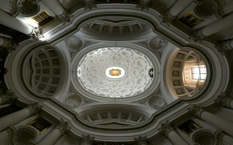 La cupola è la vera protagonista dell’intera struttura. Di forma ellittica, è caratterizzata da cassettoni di forme diverse: cruciformi, esagonali e ottagonali. Più si sale verso la lanterna centrale e più queste forme diventano piccole, dando anche qui vita ad un effetto ottico che rende la cupola più alta.