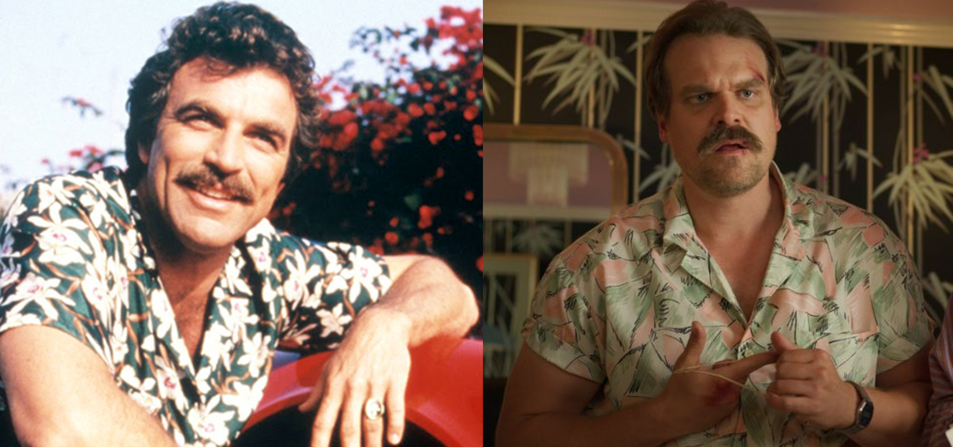 Se Dustin ed Erica, strisciando nei condotti di aerazione dello Starcourt, restituiscono una goffa imitazione di John McClane (Bruce Willis) in Die Hard, quando Hopper (David Harbour) riesce a puntare la pistola alla testa del sicario russo nell’episodio cinque (The Flayed), il dialogo che ne consegue è pressoché identico a quello che intercorre tra John e un terrorista tedesco nel film di John McTiernan. “Policemen have rules”, è ciò che fa dubitare Grigori (Andrey Ivchencko) circa l’effettiva validità delle minacce di Hopper. A proposito di questo indistruttibile, spietato, quasi “robotico” assassino: ricorda qualcuno? Il Terminator di Arnold Schwarzenegger, ovviamente! Dal canto suo, il buon Hopper ruba consapevolmente il look al Tom Selleck di Magnum, P.I. e pare che qualcuno abbia già provveduto a farne una parodia.