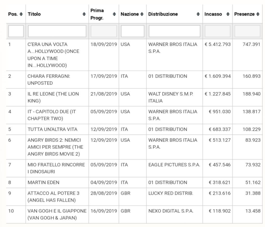 Segue in quarta piazza l’altro titolo che ha infiammato la prima parte di settembre, It: capitolo 2, che come il film Disney ha ormai esaurito gran parte della sua forza e incassa € 951.030, raggiungendo i 9 milioni totali. È ormai certo che chiuderà decisamente al di sotto dei 14.5 milioni del primo capitolo, ottenendo comunque un ottimo risultato, che assume una portata straordinaria se rapportato alla media dei film horror nel nostro paese.