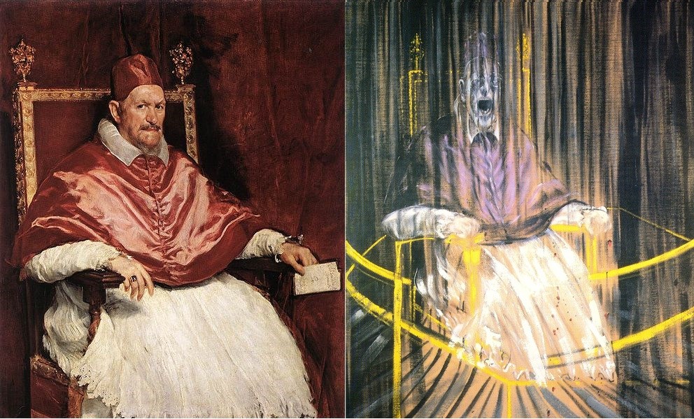 Dal 1947 dipinse la sua serie più nota: i Pontefici, per un totale di quarantadue quadri. Nello Studio dal ritratto di Innocenzo X di Velázquez (ispirato al celebre quadro del pittore spagnolo dipinto nel 1650) spicca il viso dai tratti esasperati e la bocca spalancata, come se non potesse soffocare un urlo di dolore così denso e corporeo che sembra colpirci in pieno. Il sedile è appena tratteggiato con poche ma significative linee, che ne fanno cogliere la struttura portante. Solo la punzonatura della spalliera presenta dei decori, unica concessione al rango del Panphilj. I colori sono freddi e violenti, come le pennellate, che assomigliano più a ferite su un corpo in agonia. La figura è in parte ispirata al viso insanguinato della vecchia bambinaia nel film di Sergej Michajlovič Ėjzenštejn, La Corazzata Potëmkin (1925), che il pittore aveva forse visto a Berlino in gioventù. Un ulteriore riferimento alla cinematografia è nelle pennellate verticali, quasi a voler simulare un fotogramma rovinato. Il volto è quello di un pontefice contemporaneo, papa Pio XII, di cui l’artista conservò ritagli di giornale.