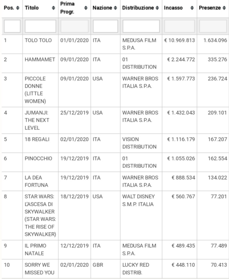 Esordio estremamente convincente in seconda posizione per un altro film italiano: Hammamet di Gianni Amelio, che sorprende con € 2.244.772, vincendo la sfida con Piccole Donne di Greta Gerwig, il quale debutta in terza con € 1.597.773.