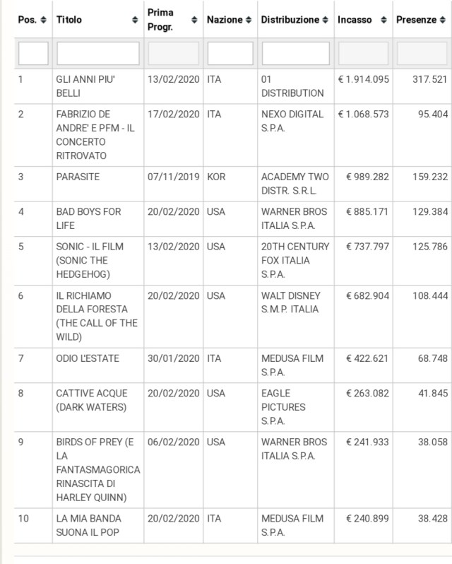 Debutto blando, invece, per Bad Boys For Life, nuovo capitolo della nota saga action/comedy che non va oltre la quarta posizione e € 885.171, seguito a breve distanza da Sonic- Il Film, quinto con € 737.797 settimanali e 2.2 milioni totali.