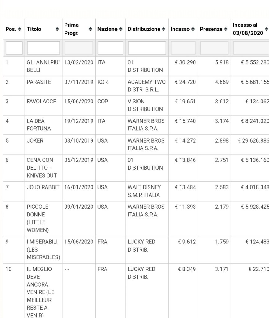 Nel frattempo la classifica continua ad essere guidata da titoli distribuiti prima della chiusura, come Gli anni più belli di Gabriele Muccino, ancora primo con € 30.290 e 5.5 milioni totali, e Parasite di Bong Joon-ho, secondo con € 24.720 settimanali che portano il suo totale vicino ai 5.7 milioni di euro. Resiste in terza posizione anche Favolacce dei fratelli D’Innocenzo, che aggiunge altri € 19.651 al suo totale da € 134.062, interamente raccolto nel periodo successivo alle riaperture.