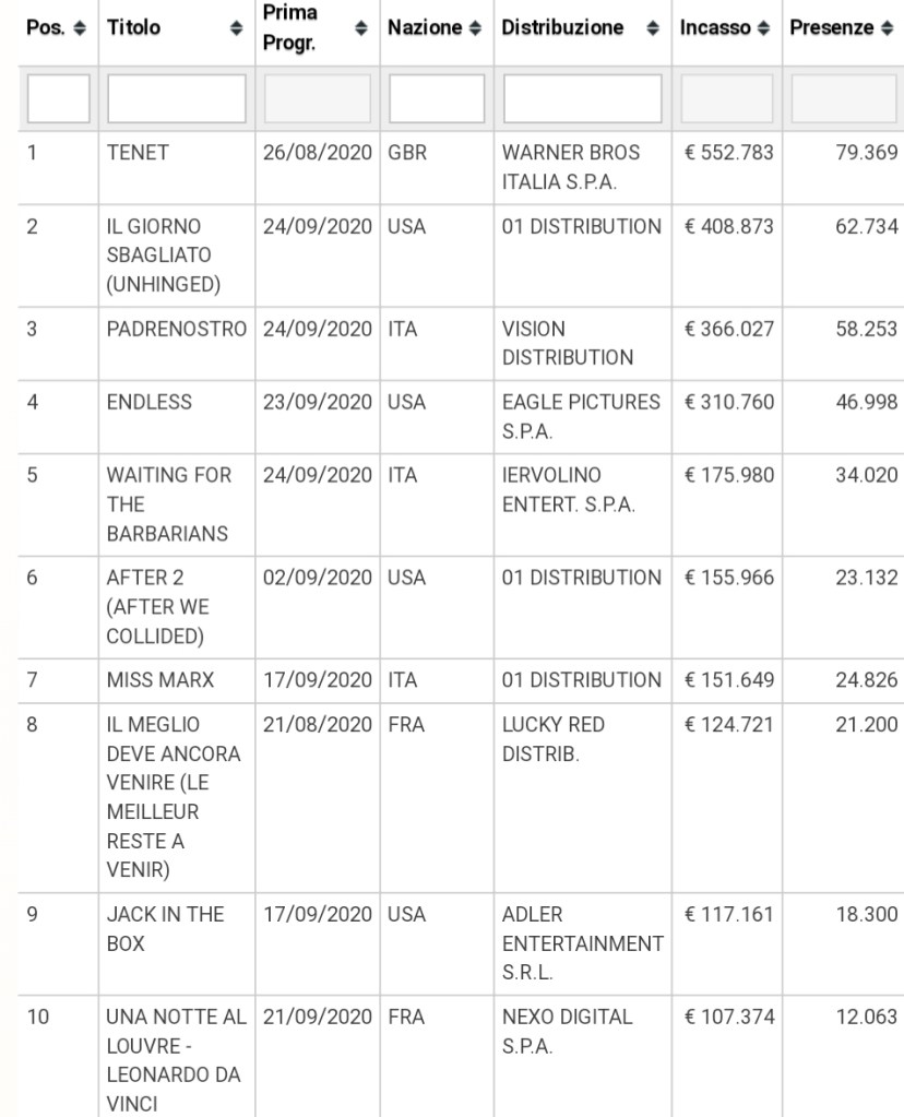 In prima posizione troviamo ancora Tenet, kolossal di Christopher Nolan che aggiunge € 552.783 al suo totale che supera i 6 milioni di euro: di gran lunga il maggiore successo dalle riaperture del 15 giugno.