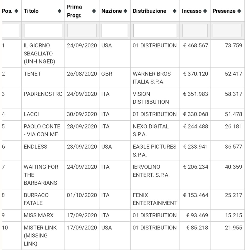 Scende in seconda posizione Tenet di Christopher Nolan, che con € 370.120 settimanali raggiunge i 6.4 milioni. A livello mondiale il kolossal Warner ha superato i 300 milioni di dollari, cifra ancora molto distante dai 500 milioni necessari a coprire i costi di produzione e distribuzione: sembra che dopo una serie di successi clamorosi, Nolan si stia avviando verso il primo grande flop della sua carriera. Inutile sottolineare nuovamente quale sia la principale causa di questo insuccesso. Lo studio si è assunto un rischio enorme in un momento molto delicato e purtroppo questa scelta, per quanto apprezzabile, non ha dato i risultati sperati.
