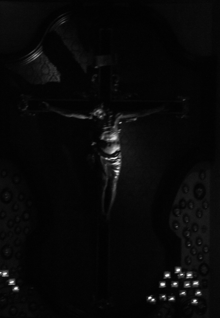 V: Molte di queste foto le ho riscoperte dopo averle fatte, a distanza di tempo: le avevo scattate anni fa, in diversi posti, per esempio Torino e Milano, ma solo adesso le ho incluse nella mia raccolta. Ricordiamo sempre che questa parte si chiama “Mater Ecclesia”, ed è una Mater Ecclesia che, come vediamo dalla prima foto, rappresenta sia un barlume di luce nell’oscurità, sia l’oscurità stessa in mezzo alle luci. La foto del crocefisso, per esempio, rappresenta la croce, intesa proprio come il patimento, dell’uomo: la croce della vita, delle sofferenze che ognuno deve sopportare, e le luci in questa foto sembrano tutte parte di una sorta di malattia. La foto rappresenta proprio la decisione di Cristo di essere crocifisso, nonostante sia il figlio di Dio, in mezzo alle malattie dell’uomo. Ma la sua non è mera arrendevolezza, ci sono volontà e consapevolezza: siamo completamente circondati da oscurità, da malattie, da persone che sono solo fiochi lumini, però, nonostante ciò, ci prodighiamo perché quest’ultime siano salvate. È quasi come la figura del Filosofo, ovvero colui che nonostante la pesantezza o l’effimerità della vita stessa, si spende per migliorare la vita di coloro che lo circondano e lo ascoltano. Gesù Cristo, in quest’ottica, è un Filosofo.