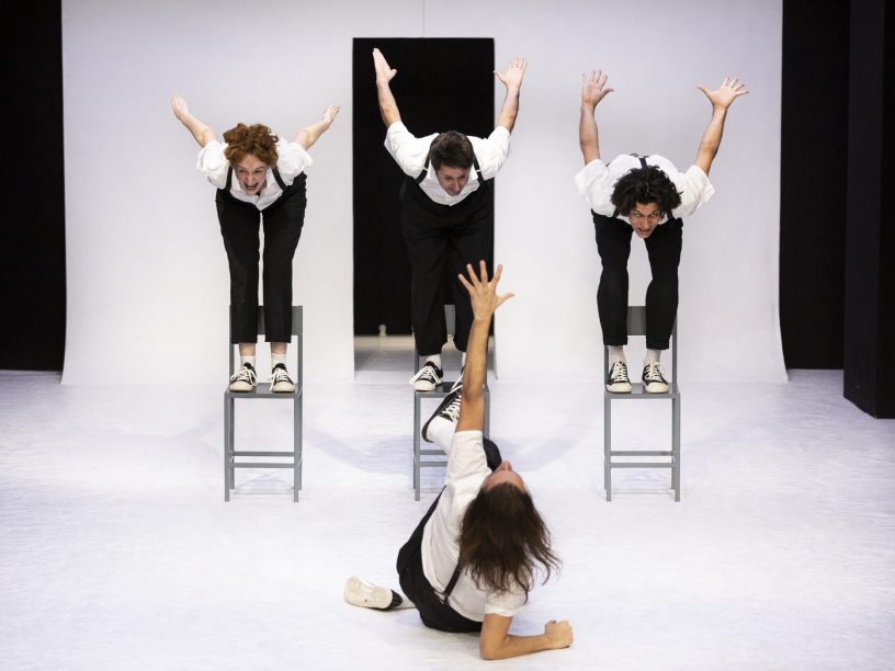 La regia è di Fabio Cherstich, che cura anche lo spazio scenico: spoglio e luminoso, con quinte nere laterali e un fondale bianco aperto sul retroscena, quest’ultimo illuminato da quella che sembra a tutti gli effetti una ribalta, un elemento che in quella posizone – stante di norma di fronte alla platea – anticipa la piega surreale che lo spettacolo si appresterà, di lì a poco, a prendere.