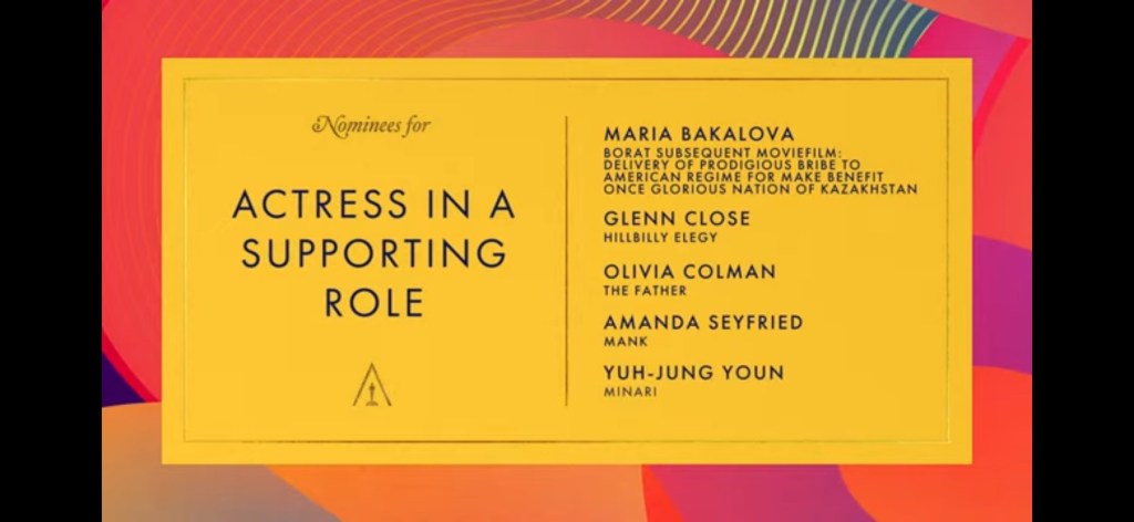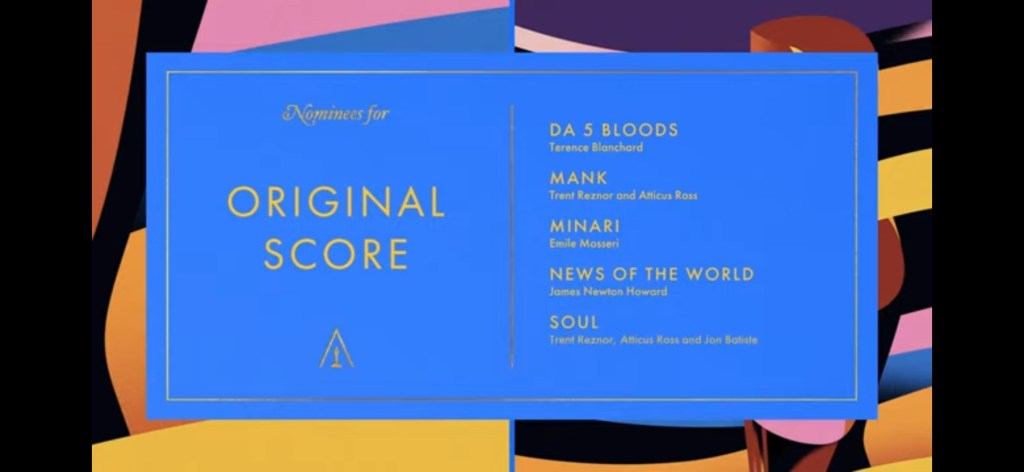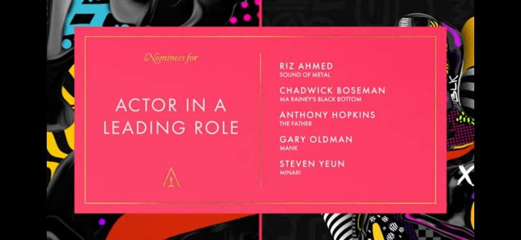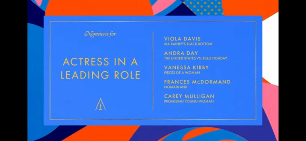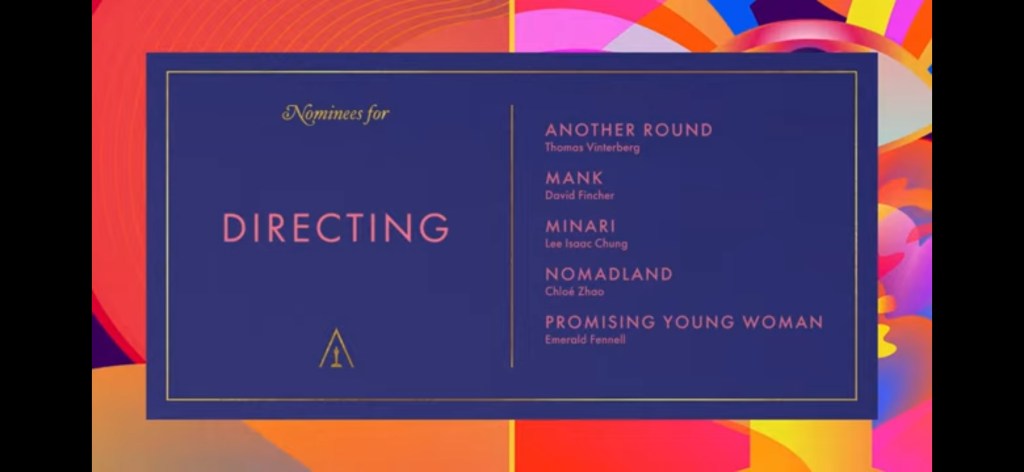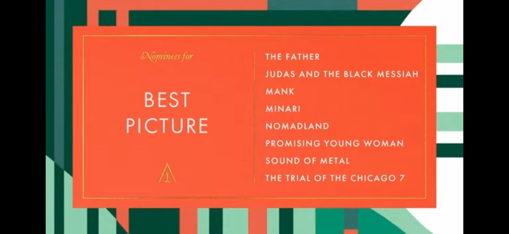 Il titolo più nominato di questa edizione (dieci) è l’ultimo film di David Fincher, Mank, dato tra i grandi favoriti negli scorsi mesi, ma depotenziato dopo la sua uscita da un consenso non unanime all’interno della critica americana. Gli altri plurinominati (con sei menzioni a testa) sono Judas and the Black Messiah, Minari, Sound of Metal, The Father, The Trial of The Chicago 7 e Nomadland. Quest’ultimo, già vincitore del Leone d’oro a Venezia 77 e del premio del pubblico allo scorso Toronto Film festival, è il grande favorito per la vittoria come Miglior Film, con la regista Chloé Zhao che potrebbe diventare la seconda donna nella storia ad aggiudicarsi la statuetta come miglior regista (la prima fu Kathryn Bigelow nel 2010 per The Hurt Locker). Oltre a tutti i titoli già citati, a competere per la categoria riservata al miglior film dell’anno c’è anche Promising Young Woman, che si aggiudica 5 nomination.