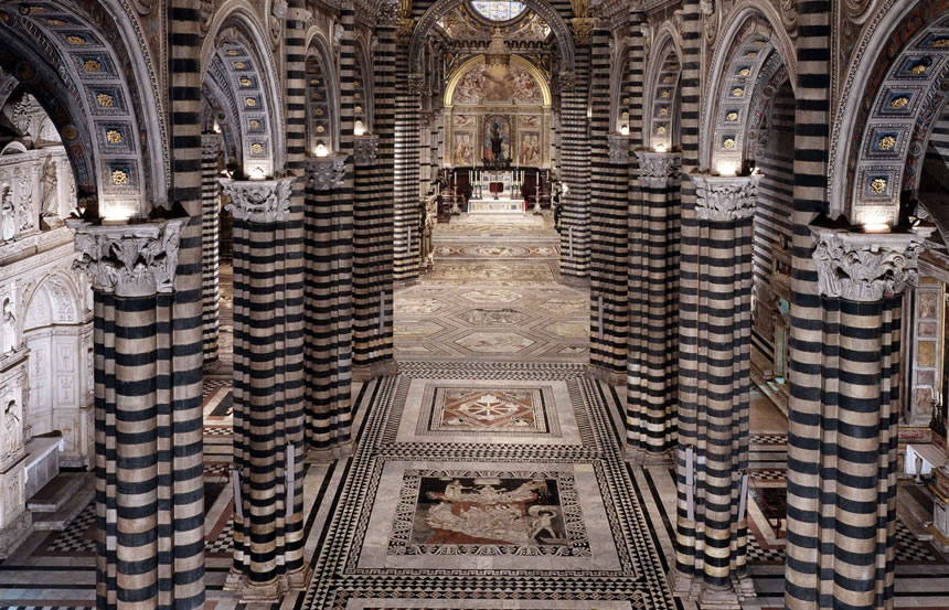 Se l’esterno del duomo armonizza splendidamente la candida luminosità del marmo bianco con il rosso di Siena e il serpentino di Prato, l’interno crea nello spettatore un effetto di meraviglia che supera di gran lunga qualsiasi altra costruzione mai vista. Un crogiuolo di marmi bianchi e neri, disposti per bande su muri e colonne, mentre una volta stellata su di un cielo turchese accompagna il visitatore fin sotto la cupola. Sia la navata centrale che il coro sono sormontati da un davanzale sovrastante una lunga fila di 171 busti di papi, realizzati da artisti rinascimentali non identificati.