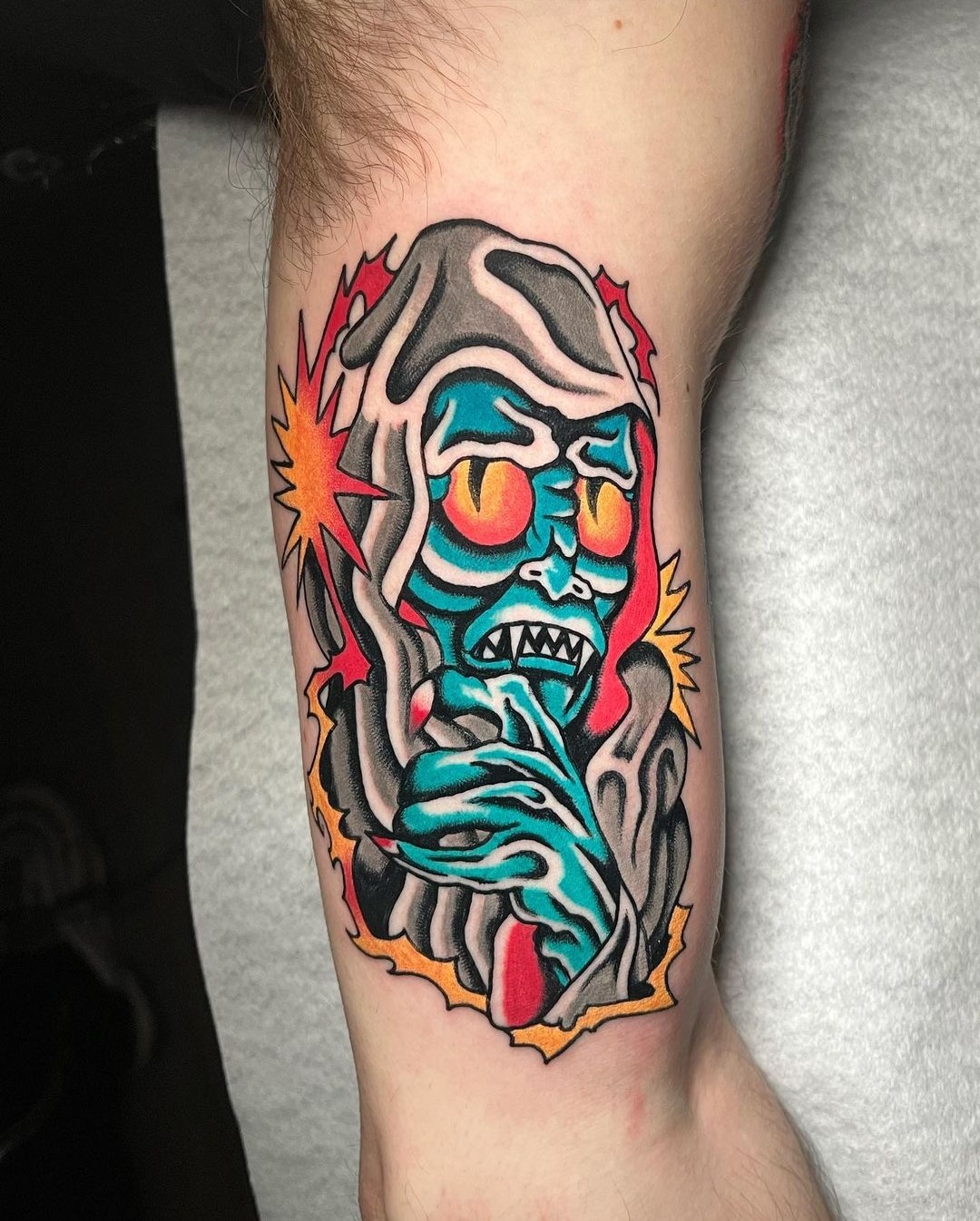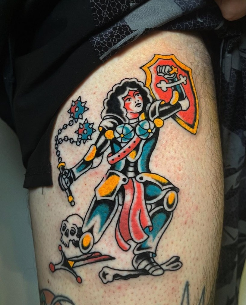 “Sono particolarmente legato alla mia carriera di tatuatore, ogni giorno lavoro incessantemente per raggiungere un punto finale, che è il riuscire a legare l’immaginario del fantasy-classico, quindi medioevale e tradizionale, allo studio del tatuaggio tradizionale americano, quindi utilizzando soggetti mescolati e tecniche alternate, con un particolare accento su quella che è la resa su pelle. Per questo unisco ad un immaginario fantasy una tecnica che ha più di cento anni di età, che è appunto il tatuaggio tradizionale americano“.