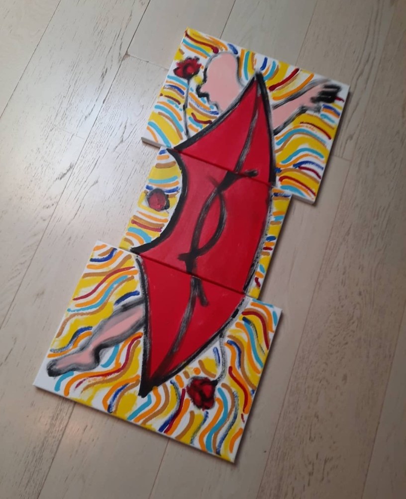 “Si chiama “Rinascita“, perché ha segnato l’inizio di un nuovo percorso artistico che ho intrapreso: se prima ho cercato di analizzare, interpretare e giocare con i simboli della società in cui viviamo, quindi quella del consumismo e dell’informazione, dopo questo quadro, che è nato molto istintivamente, realizzato in 20 minuti con pennello e tubetto, senza un minimo di traccia, sto producendo opere che vanno più verso una rappresentazione interiore, di simboli miei, a volte difficili da decodificare, ma che spero suscitino qualcosa nelle persone che le osservano”.