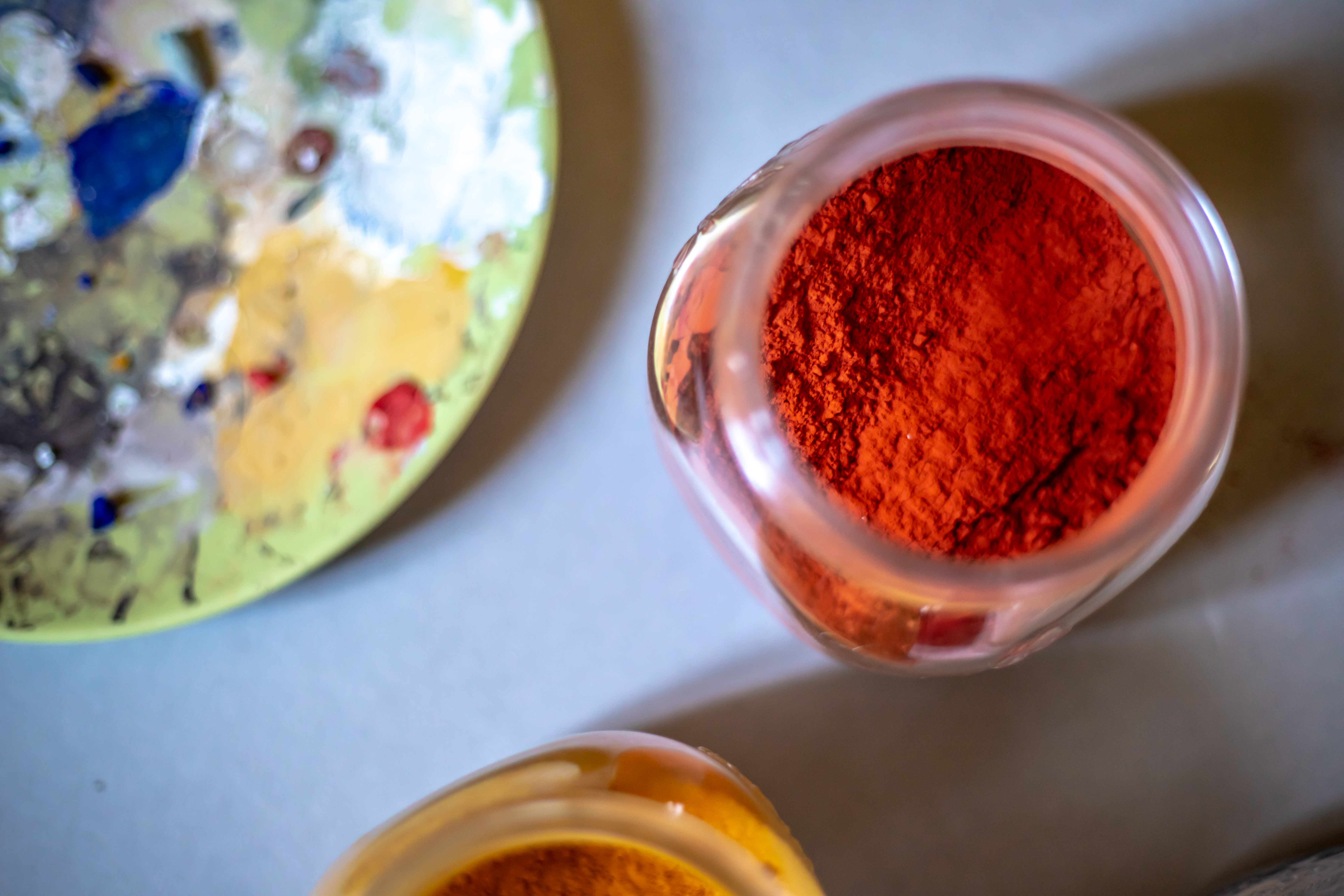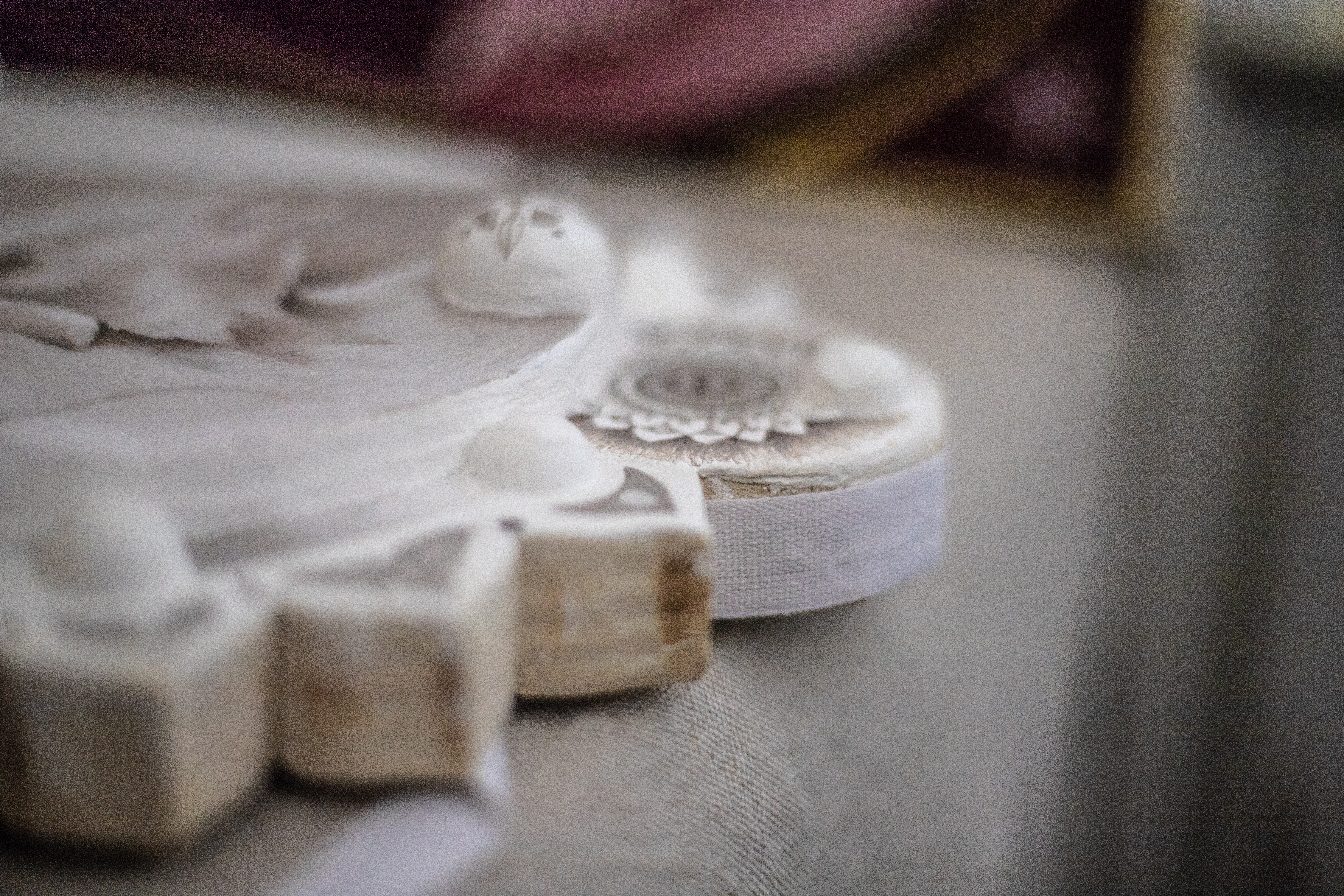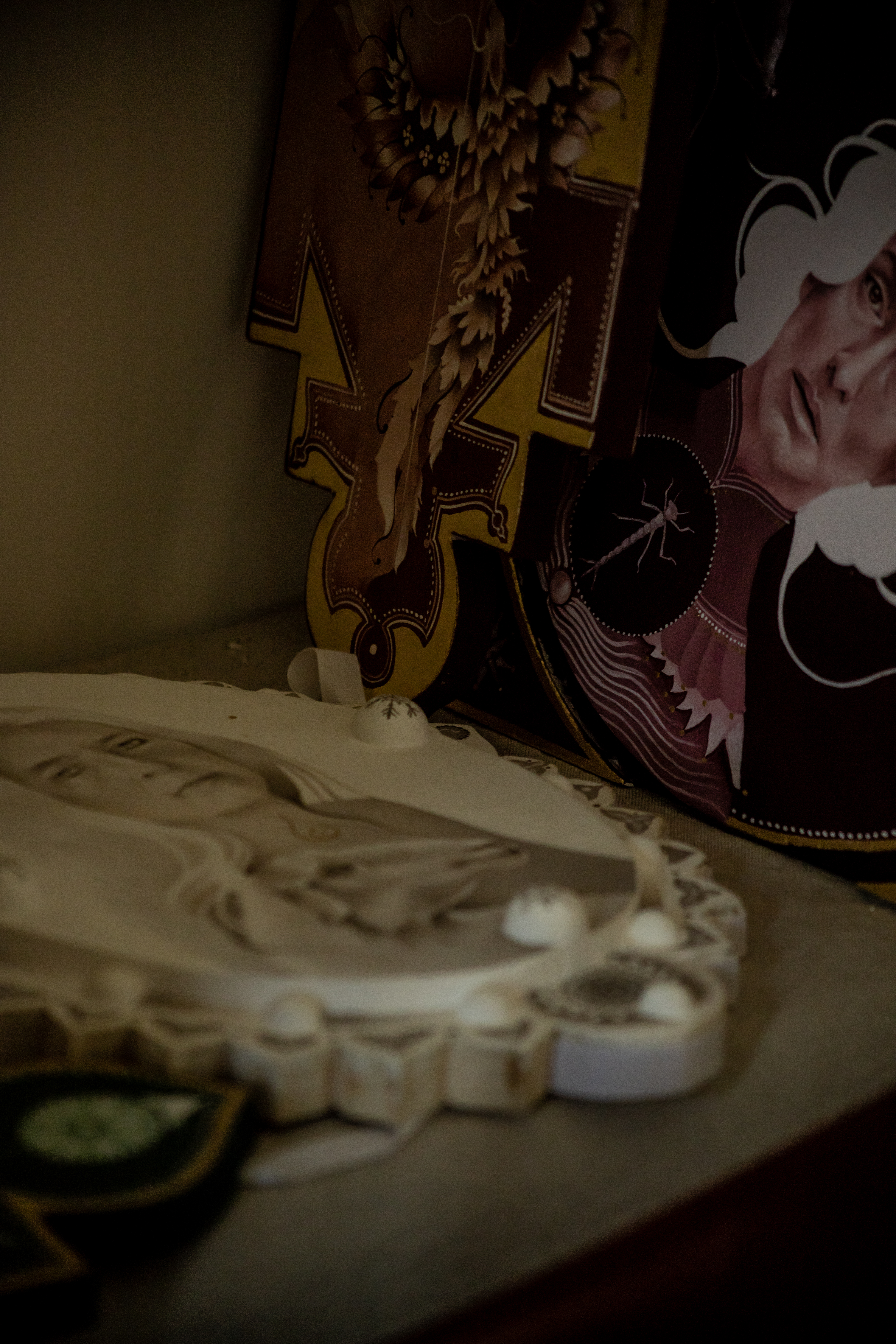 “Sono diversi anni che io ed Emiliano siamo in contatto”, aggiunge Grasso, “apprezzo molto la sua arte, le parole che utilizza, il modo in cui le racconta, quindi il mio obiettivo principale era quello di mostrare agli altri con che occhi io ho visto lui e la produzione che sta facendo. Questo elemento di luce ricamata deriva proprio dall’osservazione del lunghissimo processo creativo che accompagna la sua produzione, c’è una sorta di musica poetica in tutto il movimento che lui fa, da quando prende il legno e lo leviga, a quando ci passa su l’intonaco bianco e poi il colore. La mia volontà è stata quella di dare una sorta di dignità artistica anche a una semplice polvere colorata, cercando di far vedere agli altri, attraverso i miei occhi, quell’incanto, sia attraverso i dettagli, sia catturando Emiliano, che da artista creatore è arrivato ad essere qualcosa di creato nelle mie fotografie. Aggiungo che per realizzare ciò che è venuto fuori ci siamo chiusi in casa da sconosciuti, e questo ha reso ancora più interessante ciò che ne è derivato.”
