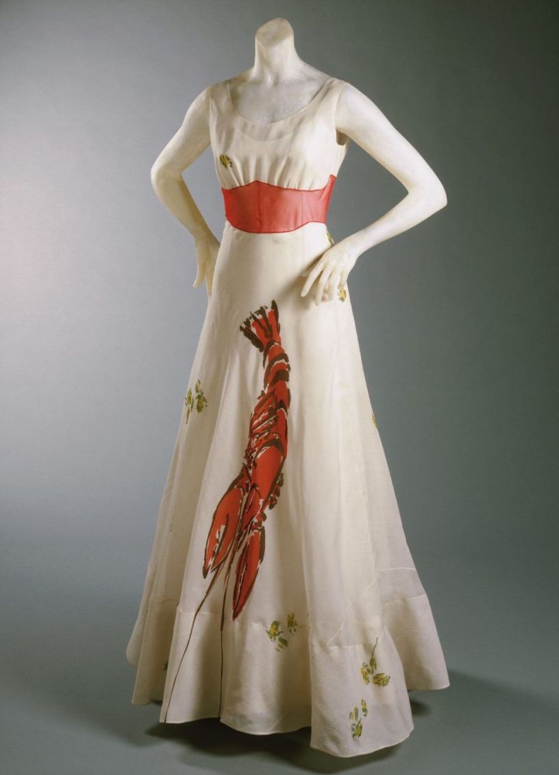 Il vestito fu commissionato alla stilista romana da una delle figure di spicco del panorama attoriale americano del tempo, l’attrice Wallis Simpson, in procinto di sposare il Duca di Windsor Edoardo VIII. Ciò che ne venne fuori fu da subito considerato un vero e proprio cult: un lungo abito bianco da sera, simbolo di purezza e pudore, reso unico e audace da un crostaceo rosso, quest’ultimo volto a richiamare la componente erotica (anche in relazione alla posizione sul vestito) e a esaltare l’abito rendendolo manifesto dello spirito libertino della Simpson, fino a trasformarlo nel “sogno proibito” delle donne dell’epoca.